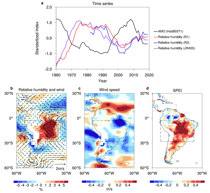 图2 a表示1960–2019年间AMO指数和SAP区域干季湿度的变化;b–d表示干季925hPa湿度、850hPa风场、地表风速和SPEI干旱指数在AMO正负位相的差异。