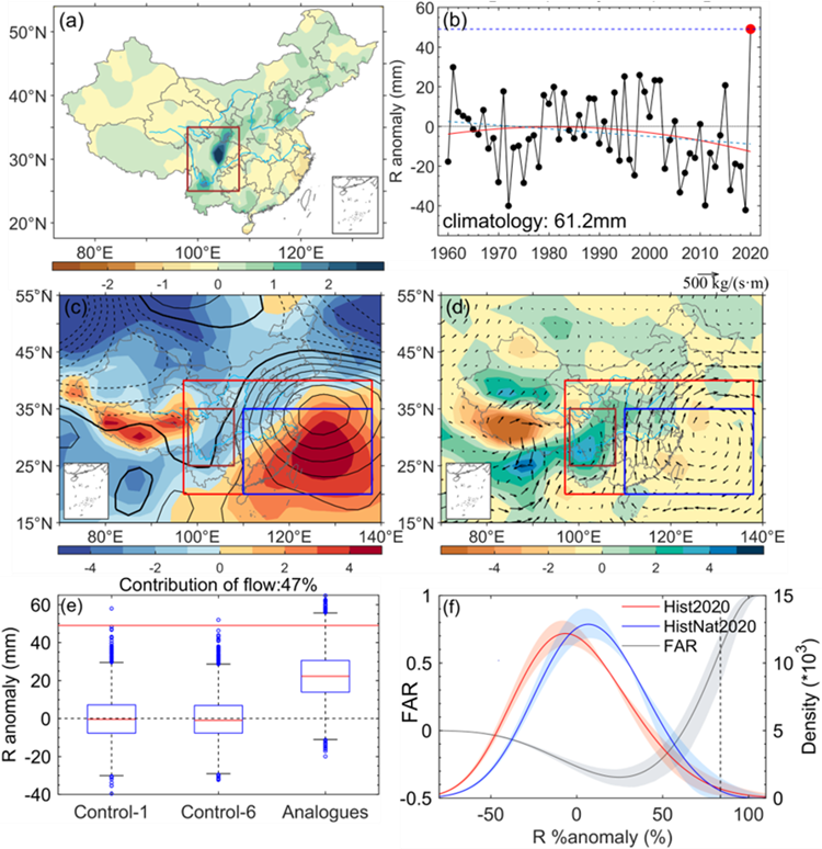 中国科学院大气物理研究所钱诚研究员、博士生叶洋波、张文霞副研究员等对这次持续性强降水事件进行了归因研究,量化了大气环流和人为强迫的贡献。结果表明,2020年8月中旬(11-20日),四川区域平均的总降水量是1960年以来最多的(图1a,b),达2.5个标准差,统计上的重现期为306年一遇。在这次事件中,受四川以东地区西太平洋副热带高压的持续控制和四川盆地西侧青藏高原大地形阻挡的影响(图1c),从南面来的水汽顺着青藏高原和西太平洋副热带高压之间的狭窄通道北上,与来自北方的冷气流交汇,在四川附近形成了水汽辐合(图1d)。基于环流相似法的估算表明,大气环流能够解释此次事件强度的47%(图1e);而在相似的天气型下,气候变化增加了强降水。为了进一步分离人为强迫的作用,他们用HadGEM3-GA6-N216大气模式,通过有、无人为强迫作用的大集合样本模拟试验,发现人为强迫使得类似事件的发生概率加倍(图1f);这种风险的增加是通过增大降水的变率来增加强降水,而不是通过改变长期趋势。该成果发表在美国气象学会会刊(Bulletin of the American Meteorological Society)。