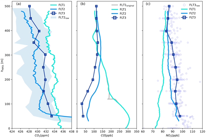 图2.北京市郊区对载荷进行了500米温室气体浓度廓线的探测实验,(a),(b),(c)分别对应三组飞行实验。