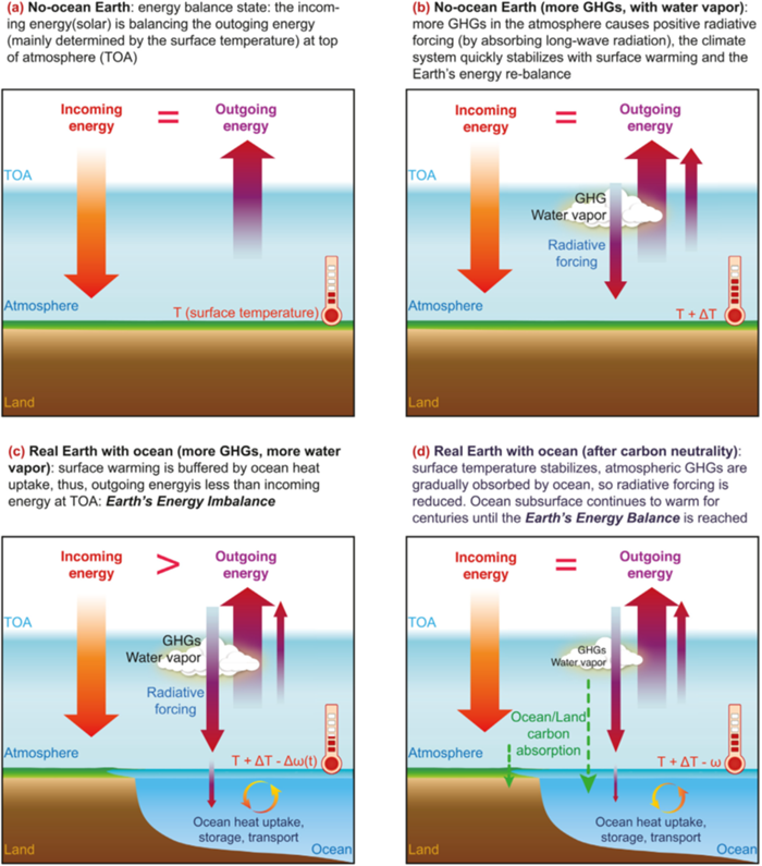 大气中温室气体不断增加,会吸收地表向外释放的长波辐射,从而减少整个地球向外释放的能量,触发地球系统能量不平衡。如果没有海洋,由于大气和陆地比热容较低,它们将快速(数年之内)响应地球系统能量的增加,使得大气和陆地升温,升温导致地球向外释放的辐射能量增加,进而使地球系统能量收支重新达到平衡,气候系统稳定在一个新的平均状态(图2)。