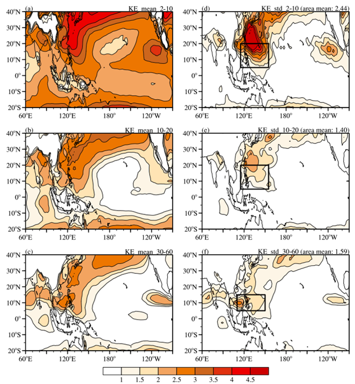 图1. 基于850 hPa扰动动能的天气尺度波强度(a,d)、QBWO(b,e)和BSISO(c,f)的夏季气候平均值(a–c)和标准偏差(d–f)(资料时间长度为1979–2018)(单位:m2/s2)。图d–f中的方框表示南海—西北太平洋区域。