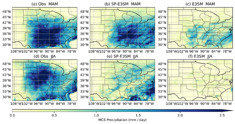 图1.美国中部地区的春季和夏季观测到的MCS降水(a和d),SP-E3SM模拟的MCS降水(b和e),E3SM模拟的MCS降水(c和f).