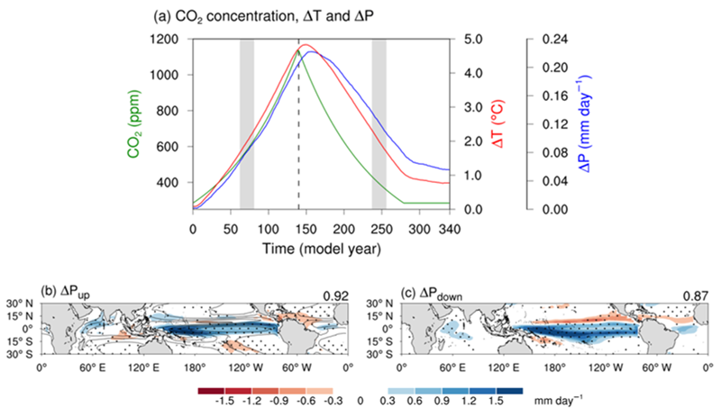 Zhou, S., P. Huang, S.-P. Xie, G. Huang, and L. Wang, 2022: Varying contributions of fast and slow responses cause asymmetric tropical rainfall change between CO2 ramp-up and ramp-down. Science Bulletin, https://doi.org/10.1016/j.scib.2022.07.010