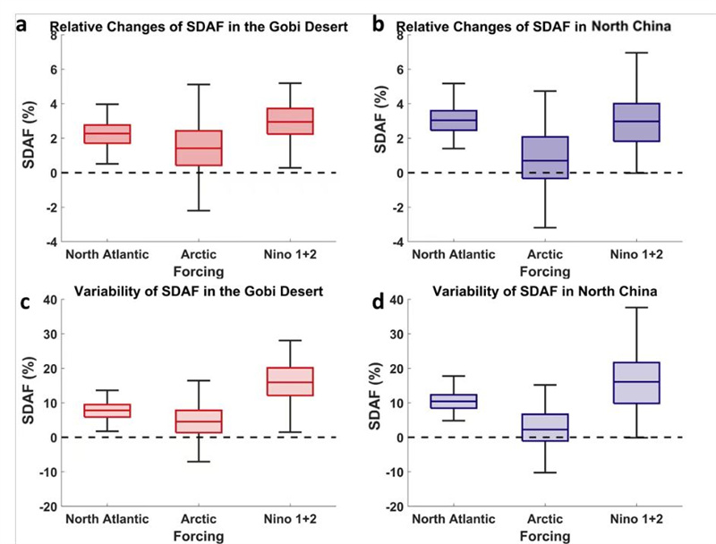 图3 北大西洋海温(℃)增加1%、北极海冰浓度(%)减少1%和NiNo 1+2区海温(℃)减少1%对 (a) 戈壁沙漠和 (b) 华北地区春季沙尘活动频率的贡献;北大西洋海温(℃)、北极海冰浓度(%)和Nino 1+2区海温的气候变率(用年时间序列的标准差代表)对 (c) 戈壁沙漠和 (d) 华北地区春季沙尘活动频率的贡献。黑色虚线代表SDAF=0,所有春季沙尘活动频率的变换均通过p<0.1的Student t-检验。