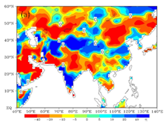 2015年以来,中国科学院大气物理研究所戴新刚研究员团队与香港天文台研究人员合作,依据CMIP5多模式数据对未来20-30年亚洲季风的可能变化进行了数年的研究,重点检验了模式集合预估偏差特征及其可能的订正方法,结果表明,模式系统性误差超过80%,其余属于非定常误差,在气候预估中这两种误差都需要订正。用线性统计方法可以订正误差中的定常及平稳部分,非平稳部分尚无法订正。在中等排放路径RCP4.5情景下,对2021-2050年CMIP5模式集合降水的订正结果显示,中国汛期大雨带将北移,新疆南部、三江源区、黄河下游、淮河流域、东北南部等地降水会明显增加,南方会频现旱情(见图1)。这与近些年我国雨带明显偏北,北方多雨,黄河汛情加重,南方不时出现干旱的实况相一致。这些变化都与全球变暖背景下亚洲季风系统格局变化有关。