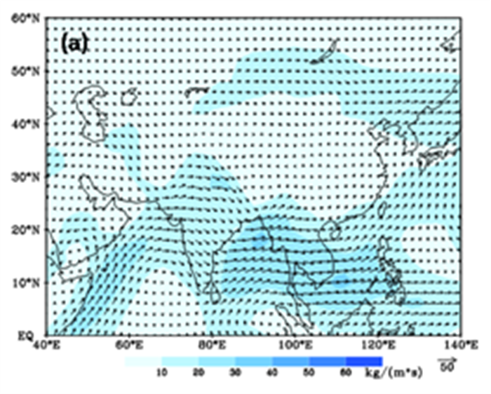 以地面至500mb水汽通量表示季风矢量,计算2016-2045年相对于1976-2005年CMIP5历史气候模拟季风差来表示亚洲季风系统的变化。结果显示在赤道印度洋出现两支附加的跨赤道向北水汽流,其西端一支从赤道索马里指向巴基斯坦,即增强了季风季节向南亚西北部干旱区的水汽输送;另一支位于80°E,指向孟加拉湾北部,中南半岛向北的季风水汽输送减弱,向西的输送增强;向北的水汽输送在中国东部沿海有所增强(见图2)。这一方面会导致南亚西北部,甚至非洲之角东部干旱区季风降水增加,恒河流域及中南半岛降水趋于减少,另一方面中国西南地区和江南中部等地易出现干旱。这与上述降水预估的订正结果基本一致,说明全球变暖背景下南亚季风与东亚季风的格局正在发生变化,其主要原因应该是,全球气候变暖造成南北半球温差增加,越赤道气流逐渐增强,南亚季风区向西扩展,向东的季风水汽输送减弱所致;而东亚季风变异还与变暖背景下海陆温差加大,副热带高压系统向北扩展有关。需要注意的是,气候的持续暖化会进一步导致中国南方旱情加重,有关部门应尽早制定适应措施,应对日益严峻的水资源短缺问题。资助项目:NSFC(41675087,42061144015)。