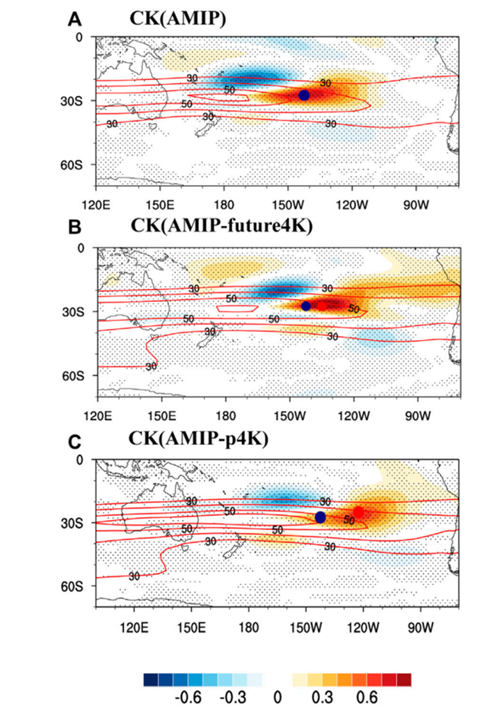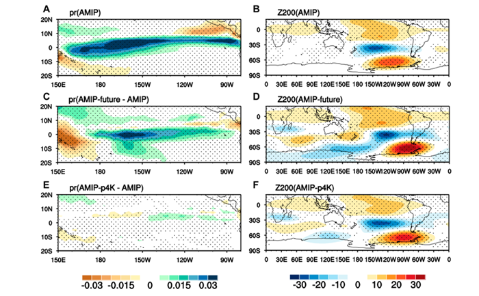 在全球变暖背景下,ENSO遥相关会如何变化?许多研究指出,厄尔尼诺型海洋增暖背景下ENSO激发的热带太平洋降水异常东移,这最终导致未来ENSO遥相关向东移动。除与热带降水异常有关之外,事实上,ENSO遥相关也受到热带外大气背景流场的影响。如黄刚研究员团队前期工作发现,副热带急流的差异对于遥相关的非对称性有重要贡献。基于这一思路,团队使用CFMIP中的系列AMIP实验发现,考虑厄尔尼诺增暖型的作用,AMIP-future4K实验可很好地复现出CMIP实验中南半球ENSO遥相关的东移。但即使不考虑海洋增暖模态的作用,仅使用均匀增暖海温强迫(AMIP-p4K实验),遥相关仍然会东移。