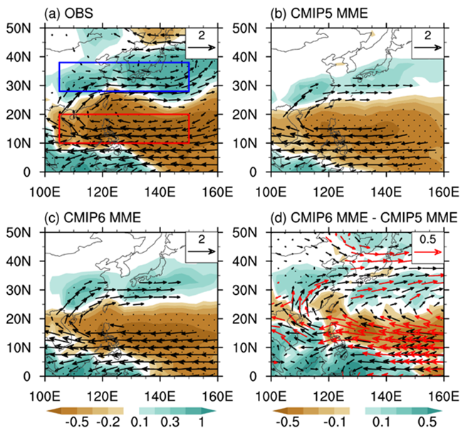 图. 东亚夏季风指数回归的夏季降水(填色;单位:毫米/天)和850hPa风场(矢量;单位:米/秒)的水平分布图。(a)观测;(b)CMIP5 MME;(c)CMIP6 MME;(d)CMIP6 MME减去CMIP5 MME。打点处代表回归的异常值通过90%的信度检验。风场为通过90%的信度检验(图d中标红为通过90%的信度检验)。