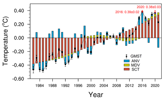 全球平均表面温度(简称GMST)是衡量气候变率和全球变暖的指针之一。以往研究认为,ENSO是影响GMST年际变率的最强信号,GMST会在厄尔尼诺时偏高、拉尼娜时偏低。例如2015/16年的超强厄尔尼诺事件就使得2016年GMST骤增,一跃成为工业革命后的最高值,并结束了21世纪初的全球变暖停滞现象。但2020年在发生了中等强度拉尼娜事件背景下,该年GMST并未明显降低、反而直逼2016年GMST的最高纪录,打破了厄尔尼诺才会使GMST冲高的传统印象(图1)。
