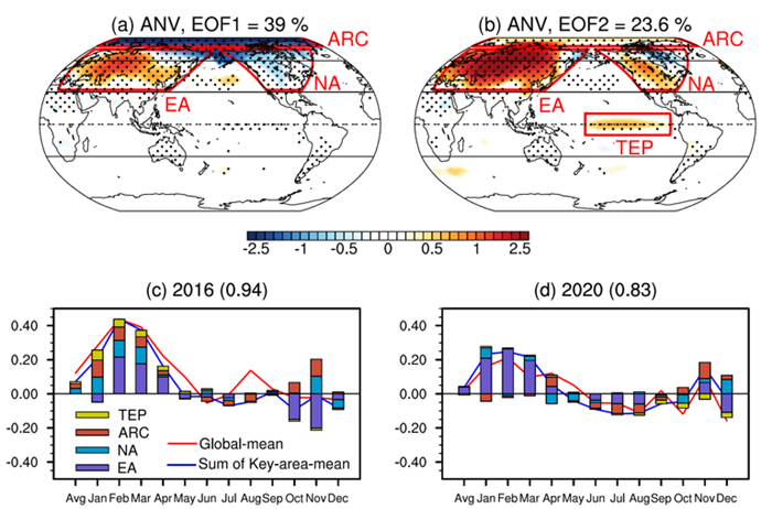 针对这一年际气候现象,中国科学院大气物理研究所郑飞研究员、博士生李柯欣、及合作者们,通过对比工业革命以来最热的2016年和2020年GMST季节内-年际尺度变化,揭示由超强厄尔尼诺导致的年际分量偏高与全球变暖长期趋势相叠加造成了2016年GMST的极端高值,而2020年GMST的极端高值则仅受到全球变暖长期趋势的影响,年际分量的作用在2020年的不同季节几乎相互抵消,年代际分量的贡献也微乎其微。