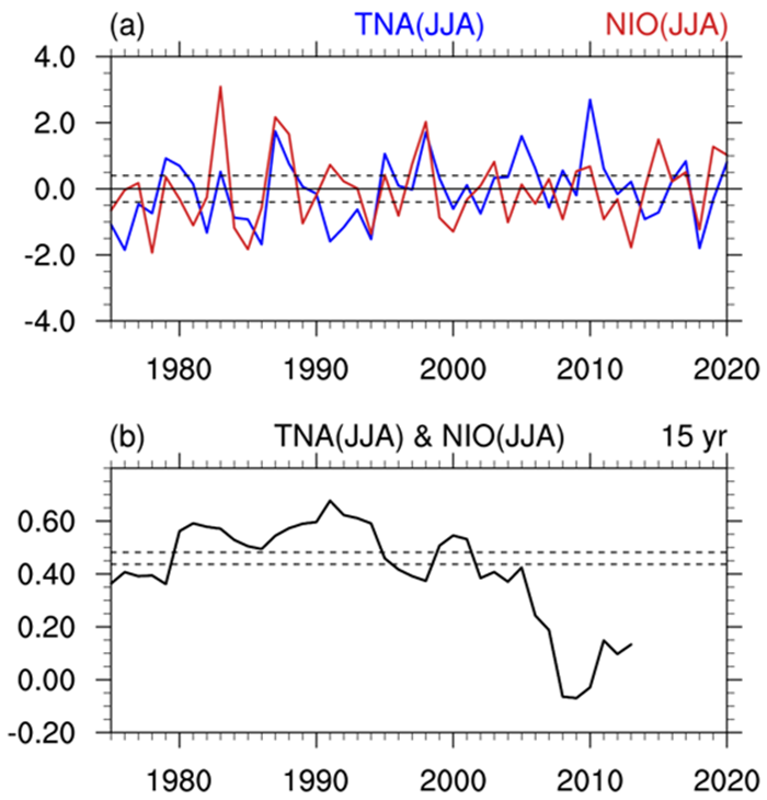 图1. (a)夏季平均的热带北大西洋(TNA;蓝色线)和北印度洋(NIO;红色线)海温指数序列。(b)两个指数的15年滑动相关系数,虚线分别代表相关通过90%和95%的信度检验。