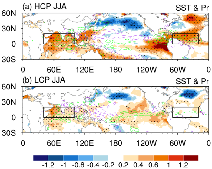 图2. (a)高相关时期(HCP)和(b)低相关时期(LCP)夏季海表温度(填色;单位:°C)和降水(等值线;单位:mm/day)的水平分布图。绿(紫)等值线代表正(负)降水异常。等值线的间隔为2 mm/day。打点处代表海温异常通过95%的信度检验。方框代表选定的热带北大西洋(0°–20°N, 70°W–20°W)和北印度洋(0°–20°N, 40°E–100°E)区域。