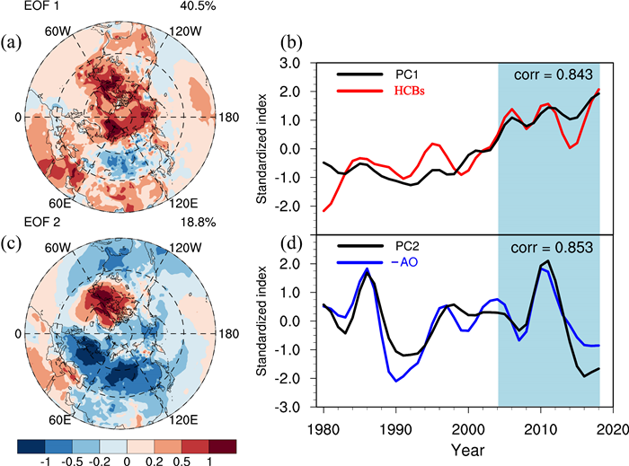 图1. 1980-2018年北半球冬季T2m的EOF(a)第一和(c)第二模态及其对应的标准化(b)PC1和(d)PC2(黑线)序列。红线表示HCBs指数,蓝线表示AO指数乘以-1。所有数据已做了9年低通滤波处理。