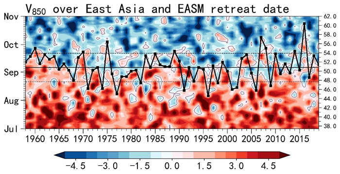 图1. 1958年—2019年东亚夏季风撤退日期的时间序列和(20°–40°N, 120°–130°E)区域平均的850 hPa 经向风风速(填色) 。