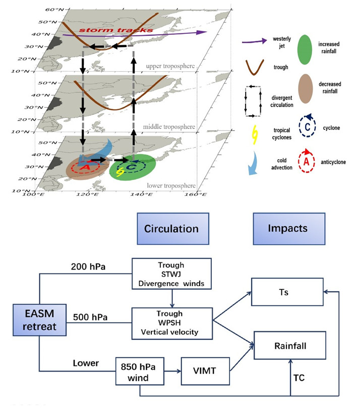 图2. 总结图示:东亚夏季风撤退的对流层三维环流特征及主要影响