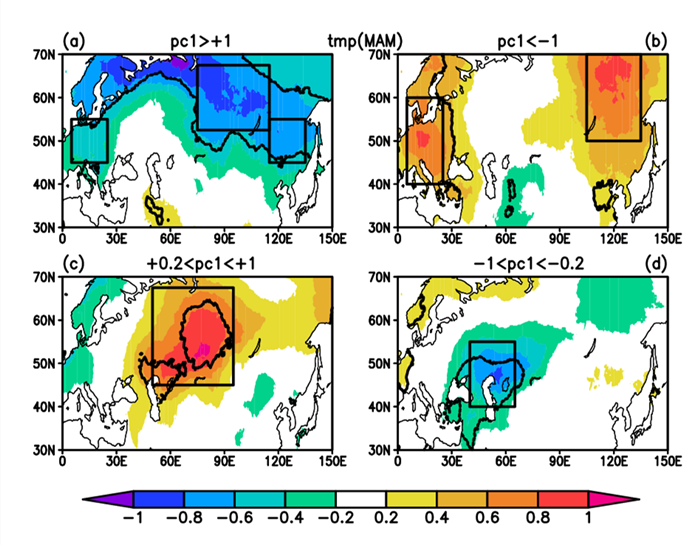 欧亚大陆气温对我国的生产生活有很大的影响。过去的研究多关注冬季和夏季欧亚大陆气温,对春季的关注较少,但春季作为冬夏交界的季节有着重要的媒介作用,探明春季气温的特征及影响因子有助于更好的了解夏季气温特征。近期有研究表明北大西洋三极型海温导致了春季欧亚大陆三极型气温,但并没有区分强度和极性。