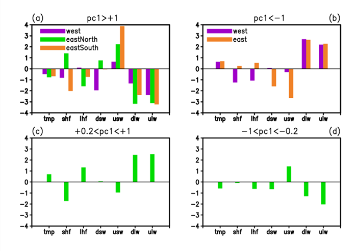 中国科学院大气物理研究所季风研究中心孙华敏博士生联合浙江大学吴仁广教授等,基于多种观测资料和大气模式模拟结果,分析了春季欧亚大陆气温在不同强度和极性北大西洋三极型海温的分布及相关物理机制。研究结果如下,首先将1951-2018这68年基于EOF分析第一模态的振幅分为五种年份并关注具有明显分布特征的四类年份——(1)PC1>+1,大阳年;(2)PC1<-1,大阴年;(3)+0.2<PC1<+1,小阳年;(4)-1<PC1<-0.2,小阴年,发现不同强度和极性北大西洋三极型海温下春季欧亚大陆气温具有不同分布特征(如图1),其次我们定量分析了各因子贡献(如图2),发现在大阳年,长波辐射和感热通量使得欧洲和贝加尔湖东侧气温降低;大阴年水平气温平流使得欧洲和欧亚大陆东侧气温上升;小阳年,同样是水平气温平流导致欧亚大陆中部的气温上升;小阴年,长波辐射和水平气温平流导致欧亚大陆中部的气温降低。该成果与7月23日发表于Theoretical and Applied Climatology杂志上。