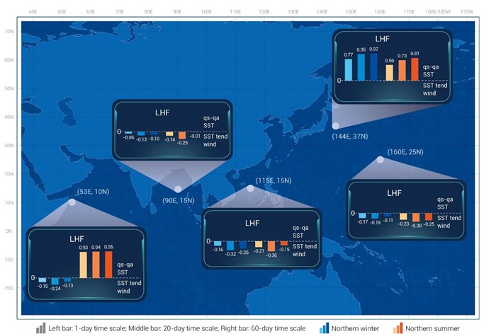 图1. LHF和SST变化关系及风速和海气湿度差贡献的季节变化和时间尺度依赖性。以阿拉伯海地区为例,夏季,LHF-SST的同时正相关随时间尺度而增大,这主要由于海气湿度差的贡献,意味着海洋强迫的作用。冬季,LHF-SST变化趋势(SST tend)之间的同时负相关先随时间尺度增大到30天左右,而后转为随时间尺度减小,这说明了风速的贡献,表明大气风场在SST变化中的作用。