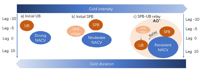 图1. 东北亚冷涡(NACV)事件与大气环流协同配置情景及对应东亚降温强度和周期的示意图:(a)与乌拉尔阻塞(UB)协同,(b)与东西伯利亚-北太平洋阻塞(SPB)协同,(c)SPB与UB接力协同。
