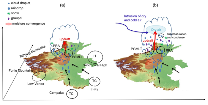 中国科学院大气物理研究所平凡研究员团队及合作者发现,受台风烟花和副高影响,强劲的低空东南气流将大量水汽源源不断输送至河南地区,同时台风查帕卡的偏南气流也向河南输送水汽,两股水汽输送通道受太行山和伏牛山的阻挡,在郑州形成强烈的水汽辐合中心,这是导致郑州暴雨LSPE较大的原因。在云微物理过程方面,强降水阶段水汽主要转化成云水和冰相粒子,并通过雨水收集云水和霰融化转化成雨水。同时郑州对流层中高层存在干冷空气侵入,干侵入导致对流层顶的高位涡区下传,使降水区对流不稳定性增强,同时干冷空气侵入导致水汽过饱和凝结,雨水收集云水效率提高,促进了极端雨强的发生。