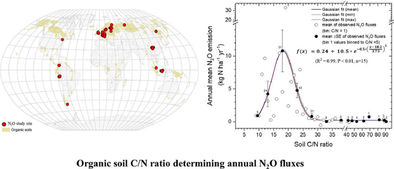 图1. 全球泥炭地自然和半自然生态系统N2O排放通量观测点分布(左);泥炭地土壤碳氮比(C/N)和N2O年排放量之间的关系(右)。