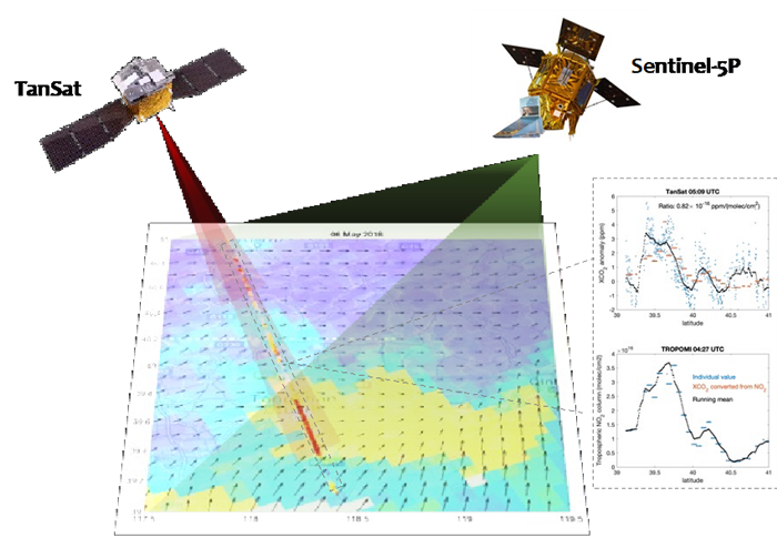利用碳监测卫星进行全球人为排放的监测更具优越性。碳监测卫星直接观测大气CO2浓度,仅凭单一CO2要素的观测,定量区分CO2浓度变化源来自于人为排放还是自然过程是一个难点问题。化石燃料燃烧为CO2人为排放之主要来源,而石油等化石燃料的燃烧伴随排放二氧化氮(NO2),即人为排放CO2和NO2具有较强的同源性,因此,理论上通过NO2和CO2的同步监测,就可以有效地计算对人为碳排放。本研究联合应用了中国碳卫星CO2观测数据和欧洲哨兵卫星的二氧化氮(NO2)观测数据,选取了我国唐山(2018年5月6日)和日本东京(2018年3月29日)两个个例,定量计算了人为碳排放和NO2的相关性。计算结果和排放清单给出的结果一致,论证了通过联合应用中国碳卫星和欧洲哨兵卫星的协同观测,可以对CO2/ NO2排放比例进行定量监测。同时,这也标志着我国已经具备空间监测人为活动碳排放的能力。