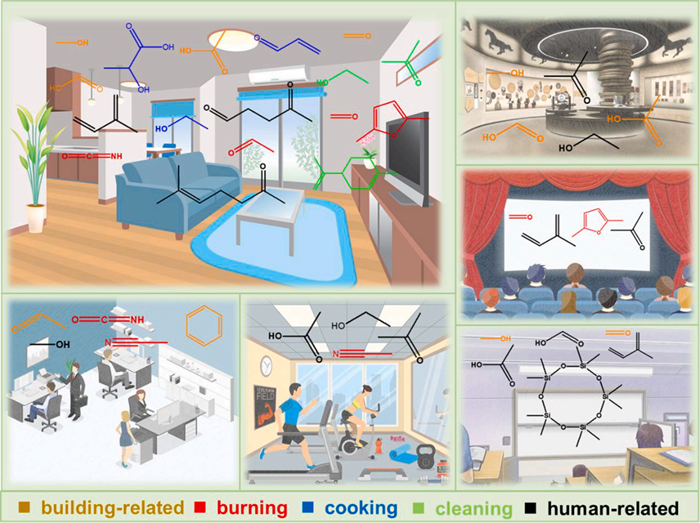 气态有机物,尤其挥发性有机物(VOCs)是大气臭氧和细颗粒物的重要前体物,也是影响室内空气质量和人体健康的关键污染物。与室外相比,室内的光照水平较低,表面积体积比较大,污染物的停留时间较短,尚缺乏对气态有机物在室内的认知。为此,LAPC国家重点实验室尤博博士和孙业乐研究员从实时在线观测研究的角度,总结了住宅、教室、体育中心、影院和博物馆等不同室内环境中VOCs的化学组成和动态变化特征(图1)。