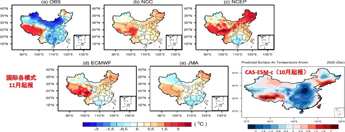 图1. 国际各季节预测模式(b-e)提前1个月对中国2020年12月平均气温的预测情况,相比之下CAS-ESM-c提前2个月的预测结果更加接近实况。