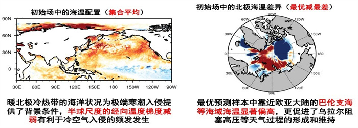 CAS-ESM-c提前准确的预测为探寻促使寒潮爆发的关键因素和物理机制提供了可能。郑飞等人通过分析初始场中的北半球海温配置和集合预测成员中的优劣差异,指出对2020/21年冬季寒潮入侵的成功预测,源于对暖北极冷热带的海洋初始条件的精准刻画,以及合理体现前期秋季北极偏暖的气候效应(图2)。暖北极冷热带的海洋初始条件为极端寒潮入侵提供了背景条件,半球尺度的经向梯度减弱有利于冷空气入侵的频繁发生。而最优预测样本中靠近欧亚大陆的巴伦支海等海域海温显著偏高,更促进了乌拉尔阻塞高压等天气过程的形成和维持。