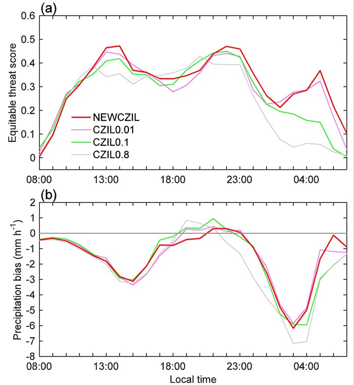 图1 2012年7月21日北京强降水事件中新方案Czil-h (NEWCZIL)、Czil=0.01 (CZIL0.01)、 Czil=0.1 (CZIL0.1)和Czil = 0.8 (CZIL0.8)方案模拟的整个降水期间(2012年7月21日08:00-7月22日08:00 LST)最内层嵌套区域平均的逐小时降水量的(a)ETS评分(降水阈值> 0.1 mm h-1),(b)偏差