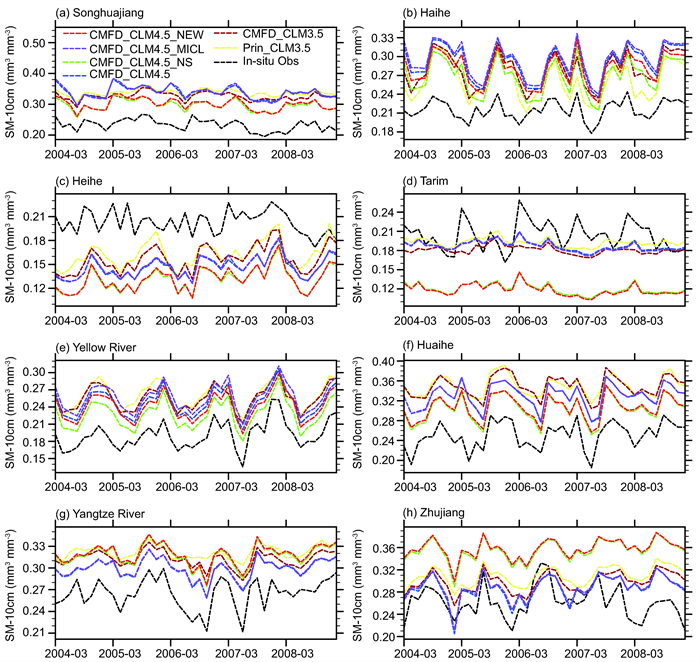 图1 中国八大流域2008-2013年观测和利用不同模式参数化方案、气象强迫和地表参数模拟的表层(0-10cm)月均土壤湿度时间序列。