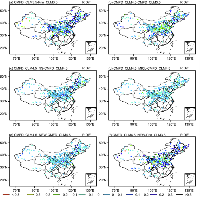 图2 不同模拟与站点观测土壤湿度相关系数的差: (a) CMFD_CLM3.5 -Prin_CLM3.5; (b) CMFD_CLM4.5-CMFD_CLM3.5; (c) CMFD_CLM4.5_NS -CMFD_CLM4.5; (d) CMFD_CLM4.5_MICL-CMFD_CLM4.5; (e) CMFD_ CLM4.5_NEW -CMFD_ CLM4.5; (f) CMFD_CLM4.5_ NEW-Prin_CLM3.5.