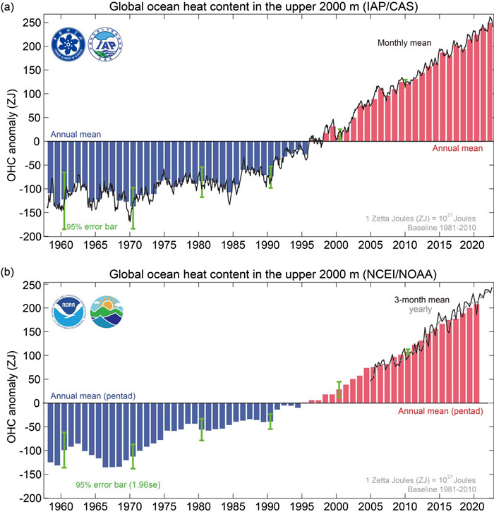 图2. 1958-2022年全球海洋上层2000米热含量变化时间序列:上图为IAP/CAS数据、下图为NOAA/NCEI数据。