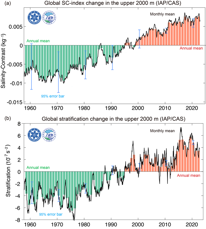 图3. 1958-2022年全球海洋上层2000米盐度差指数(上图)、层结(下图)变化时间序列。