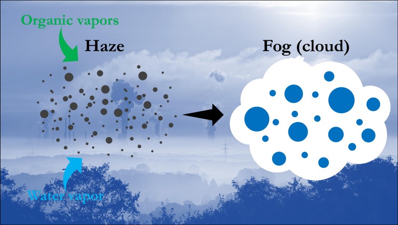 中国科学院大气物理研究所贾龙副研究员及其合作者(徐永福和段民征研究员)通过高分辨质谱技术和精细化的气溶胶动力学模式(CSVA),在深入解析甲苯气态和颗粒态分子的基础上,从云雾微物理角度解析了SOA与云雾之间的相互作用,并首次发现气溶胶-雾相互作用是导致的SOA爆发性增长的关键机制。即,霾(haze)与雾(fog)紧密交织在一起,一方面,水溶性气态有机物的存在会降低SOA活化为云雾滴的临界过饱和比,导致SOA在湿度接近或低于100%时即可活化为云雾滴;同时,云雾的生成进一步促进水溶性气态有机物的气-粒转化,从而导致了SOA的爆发式增长。还进一步分析了温度和相对湿度在SOA生成中的协同作用,发现低温可以显著放大有机气体对SOA爆发式增长和云凝结核活化的作用。上述结果表明云雾微物理过程是水溶性气态有机物快速转化为二次有机气溶胶的主要原因。