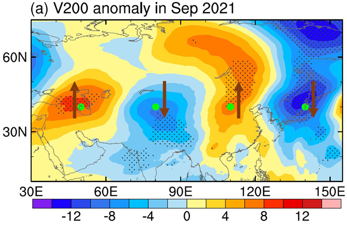 丝绸之路遥相关,红(蓝)色表示南(北)风异常。2021年9月以绿色圆点所示位置的经向风定义的丝绸之路遥相关指数为历史最强。