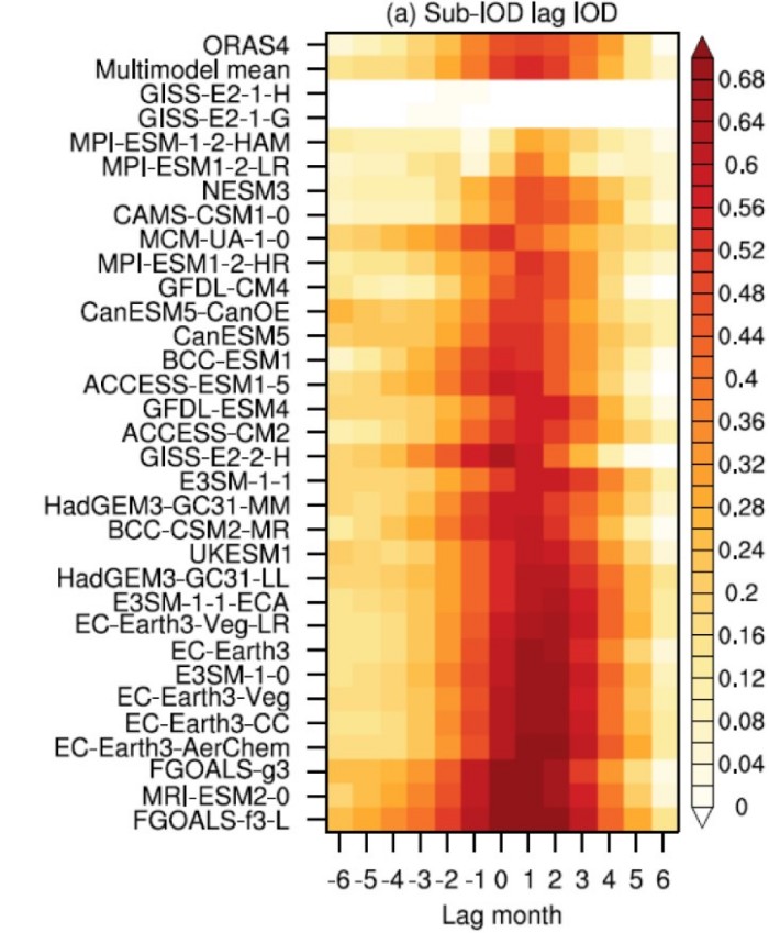 31个CMIP6模式和ORAS4中,IOD和Sub-IOD指数之间的超前-滞后相关。颜色越深代表IOD和Sub-IOD之间的耦合越强。