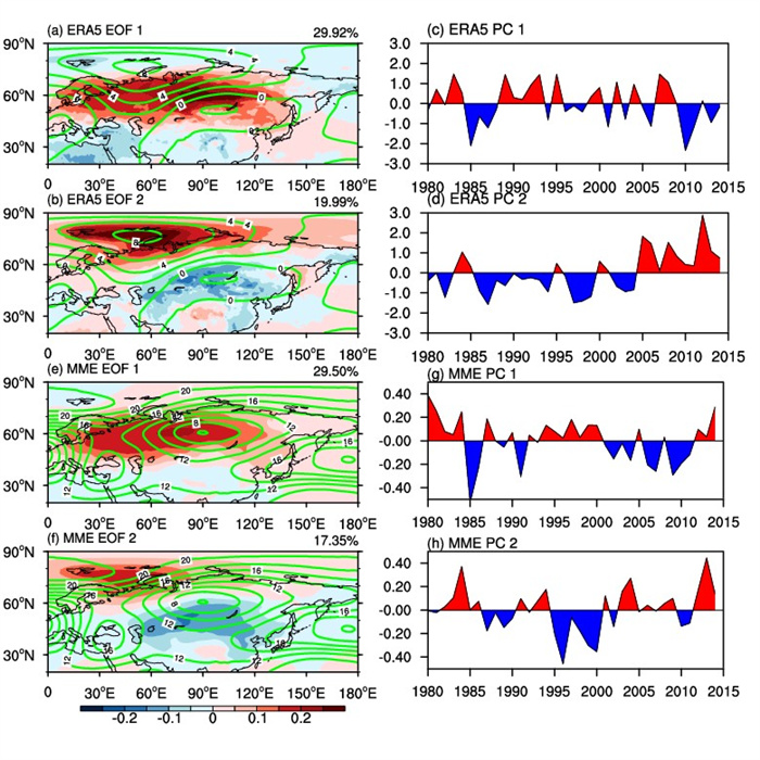图1 (a-d)ERA5和(e-h)MME在1980-2014年冬季欧亚气温的主模态分析,左列为第一模态和第二模态的空间分布,右列为对应的时间系数序列。蓝白色实现表示205-2014年与1980-2004年冬季Z500的差异场。