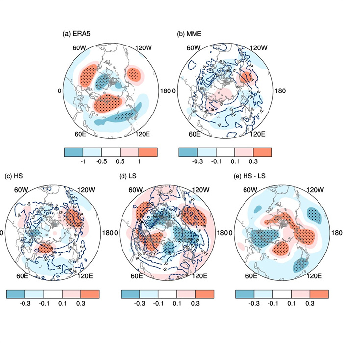 图2 将(a)ERA5、(b)MME、(c)高相关模式组和(d)低相关模式组的1980-2014年冬季Z500(去趋势)回归到WACE序列,(e)高相关组与低相关组的差异场;打点表示通过90%显著性检验,虚线表示(b)MME、(c)高相关模式组和(d)低相关模式组的合成温度与ERA5的差异。
