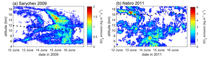图1 火山喷发二氧化硫清单中2009年Sarychev火山喷发(a)和2011年Nabro火山喷发(b)的二氧化硫排放率,黑色点表示火山上空热力学对流层顶的高度