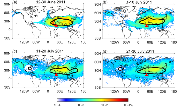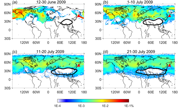 图2 南亚高压对北半球中纬度Sarychev火山喷发气溶胶传输的影响。红色三角形表示火山喷发位置,黑色等值线表示南亚高压位置