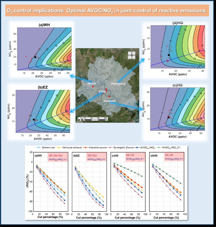 大气所王莉莉副研究员团队联合湖北省生态环境监测中心站、中国气象科学研究院、南京信息工程大学、中山大学等单位,利用2019年8月武汉城市圈多城市同步观测的O3及其前体物和气象要素资料,综合利用光化学箱模型(NCAR-MM)、正交因子矩阵分解模型(PMF)、相对增量反应活性(RIR)和经验动力学模拟(EKMA)方法,对该区域O3生成机制、O3-NOx-VOCs敏感性、挥发性有机物(VOCs)的来源及对臭氧生成贡献进行解析。研究表明,鄂州局地臭氧生成速率P(O3)最高,黄石、武汉和黄冈略低,其中(NO+HO2)过程主导着O3的光化学生成,(NO2 + OH)过程主导O3光化学损耗,夜间(O3+烯烃)对于O3的汇作用也不可忽视。O3生成均主要受以芳香烃、氧化型有机物(OVOCs)以及烯烃(二甲苯、异戊二烯、2-丁烯、2-甲基丙烯醛和正己醛等)为主的人为源VOCs控制;VOCs主要来源为机动车、工业、溶剂使用、燃料挥发、液化石油气使用和生物源排放。EKMA表明武汉、鄂州、黄石和黄冈AVOC/NO2最佳削减比例为5:1、4:1、6:1、5:1时,若针对上述城市关键排放源进行前体物的协同减排,可缓解O3污染;此外,不同城市需根据自身产业结构施行因地制宜的管控调整,重点应针对机动车、溶剂使用和工业源进行管控(图1)。