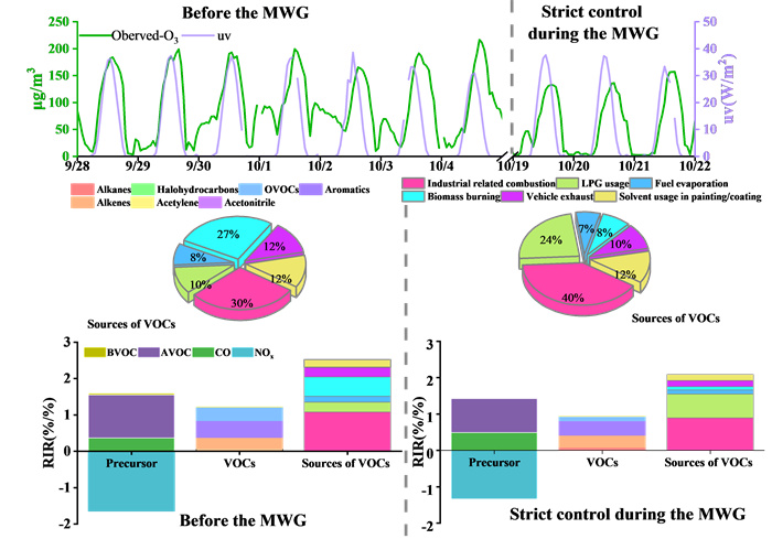 另外利用上述研究方法,结合“去气象”的机器学习模型,评估了2019年10月第七届世界军人运动会(MWG)举办期间减排措施对武汉市O3污染的效用。在MWG期间,O3、NOx和挥发性有机化合物(VOCs)的浓度、OFP(O3生成潜势)分别比MWG前后显著降低,并且剔除气象因素的影响后,MWG期间O3及其前体物也有不同程度的下降,显示减排措施对O3的下降起到了重要作用。O3的生成对VOCs敏感,关键物种主要是来自溶剂使用源、生物质燃烧源、工业相关燃烧源和汽车尾气的芳香族、OVOCs和烯类,MWG期间生物质燃烧和溶剂使用源的贡献大幅度降低,而在严格控制期间,O3浓度的下降主要是由于生物质燃烧控制导致的OVOCs减少(图2)。整体而言,武汉市的O3减排策略应侧重于减少高活性的VOCs物种。
