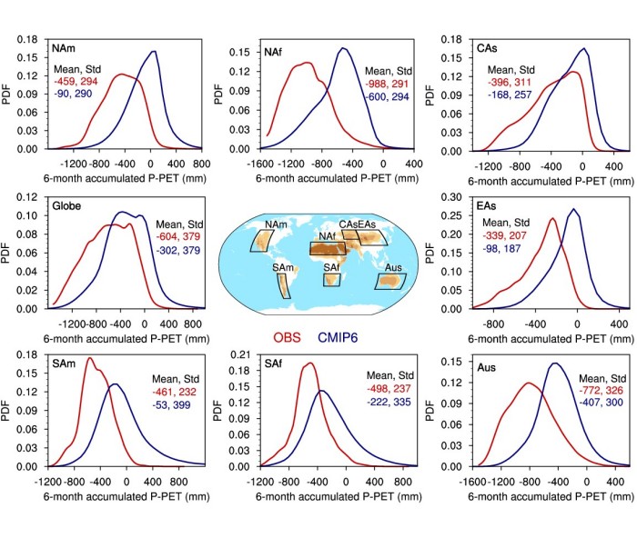 “我们的评估结果整体肯定了当前气候模式对全球干旱区气象因子和干旱事件对应水热条件的空间分布。”文章第一作者于晓晶博士指出。“但是,由于降水量被高估、潜在蒸散发被低估,CMIP6模式模拟的旱区水分亏缺程度约偏弱50%。”