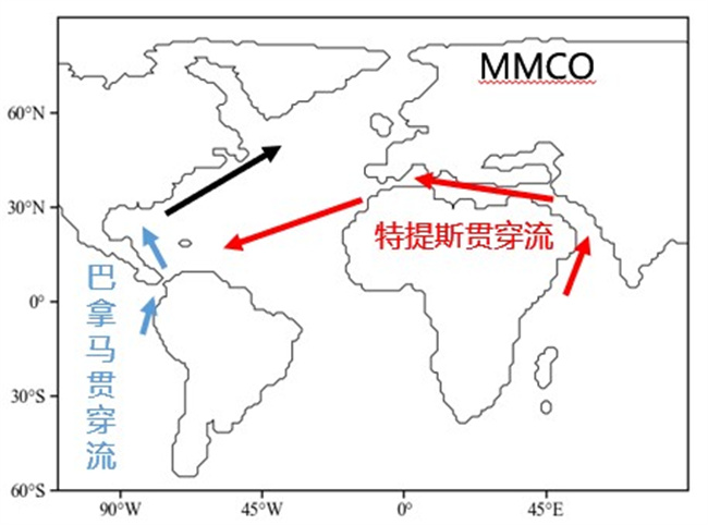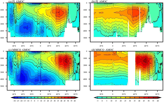近期,中国科学院大气物理研究所刘海龙研究员团队与中国科学院青藏高原研究所赵彦利用耦合气候模式FGOALS-g3和MMCO边界条件对MMCO进行数值模拟试验,比较MMCO与现代的气候差异和海洋环流状态,并使用“能量平衡模型”分析各辐射强迫因子对MMCO地表温度变化的贡献。结果表明,MMCO全球地表温度比现代高出4.69℃,并且MMCO时期森林覆盖率的增加降低了地球的地表反照率,地表反照率和温室气体变化对全球地表增暖起着主要的作用。同时,巴拿马海道和特提斯海道开放后,低盐度的巴拿马贯穿流与高盐度的特提斯贯穿流在北大西洋西部汇合(图1),导致湾流增强并使MMCO在北大西洋高纬出现更强的经圈翻转流(AMOC,图2),这两个海道引起的海洋环流变化为中新世AMOC的形成和演变的机制提供了全新的视角。