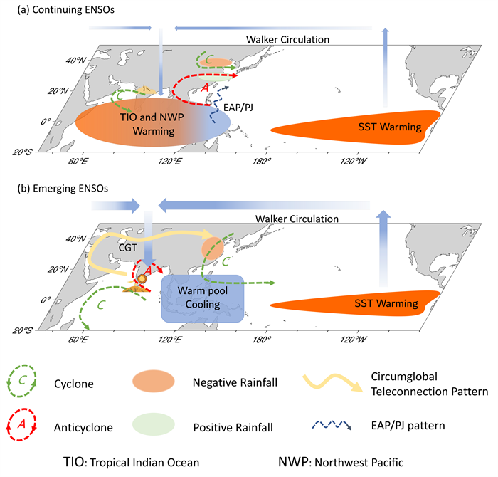 图1 (a)延续型ENSO和(b)新发型ENSO对东亚及南亚夏季风的影响示意图。