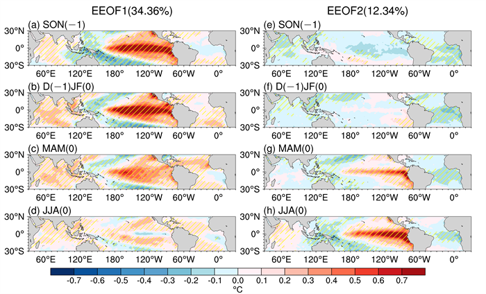 图2 对9月到次年8月的热带SSTA做EEOF分析所得到的前两个主模态。