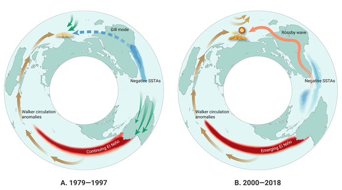 随后进一步指出NPO和SPO的年际关系在2000年左右从正相关转变为负相关,这正好解释了ENSO在2000年所经历的年代际转变现象,即从延续型ENSO转变为新发型ENSO。