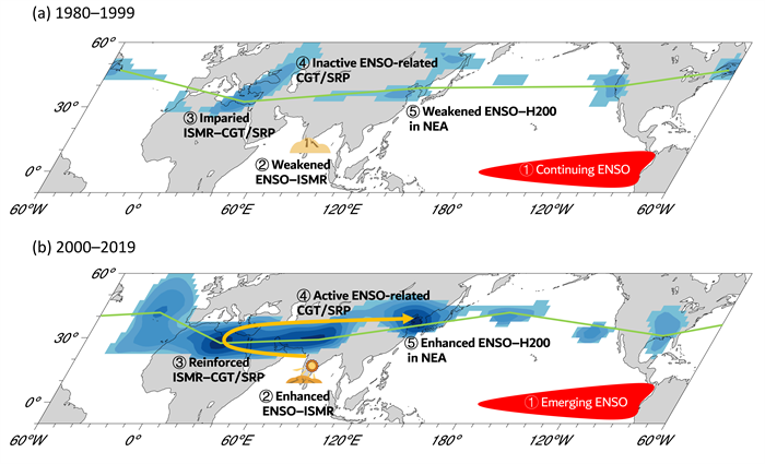 由于南亚夏季风能显著影响东北亚的环流场,因此ENSO与南亚夏季风的年代际转变进一步导致夏季ENSO和东北亚环流场也经历了年代际转变,即从70年代初开始减弱,此后在80年代中期保持相对稳定,并自1999/2000年出现新的年代际增强。其中中纬度地区的环球遥相关波列(CGT)和丝绸之路遥相关波列(SRP)起到了重要的“桥梁”作用(图4)(Yang, Huang, et al. 2022b)。