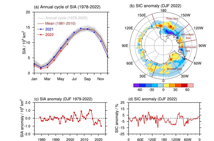 Chao Zhang, Shuanglin Li, 2023. Causes of the record-low Antarctic sea-ice in austral summer 2022. Atmospheric and Oceanic Science Letters, https://doi.org/10.1016/j.aosl.2023.100353